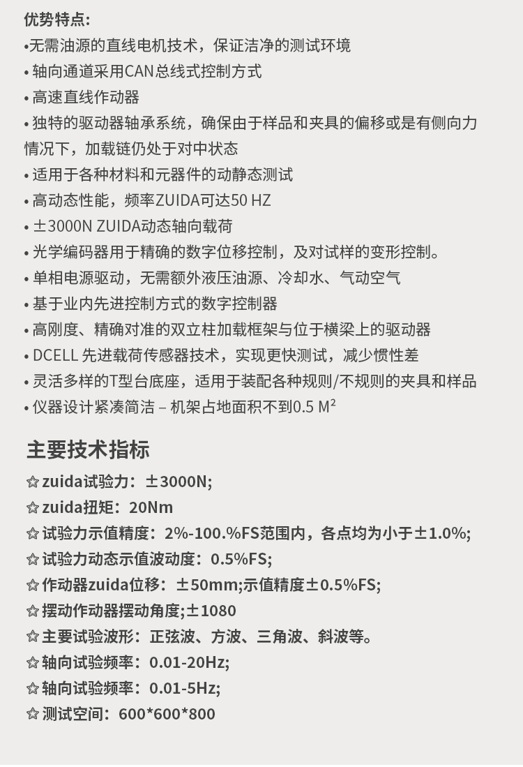 由于該系統(tǒng)采用自適應無間隙的電動伺服作動器,頻響速度快,噪音低,節(jié)能環(huán)保,非常適合企業(yè)和研究機構(gòu)對小零部件的研究測試!
