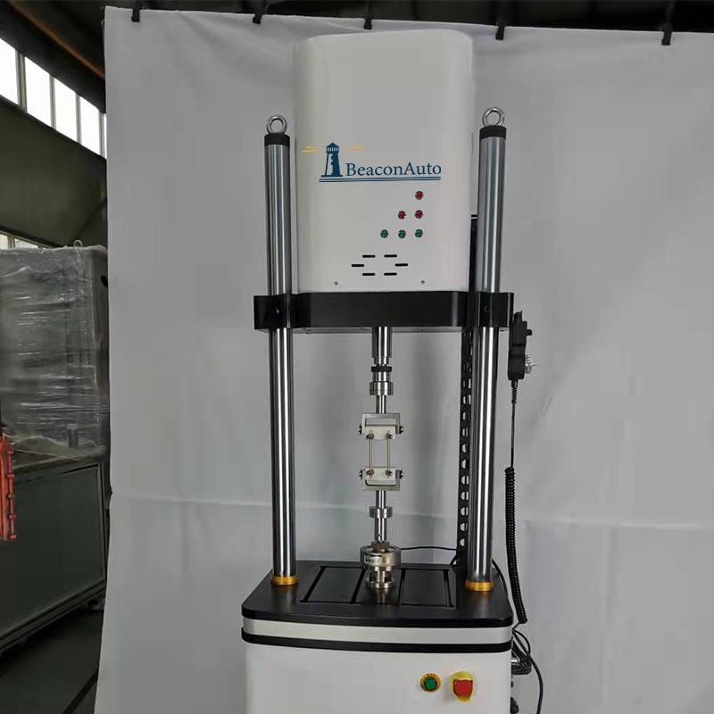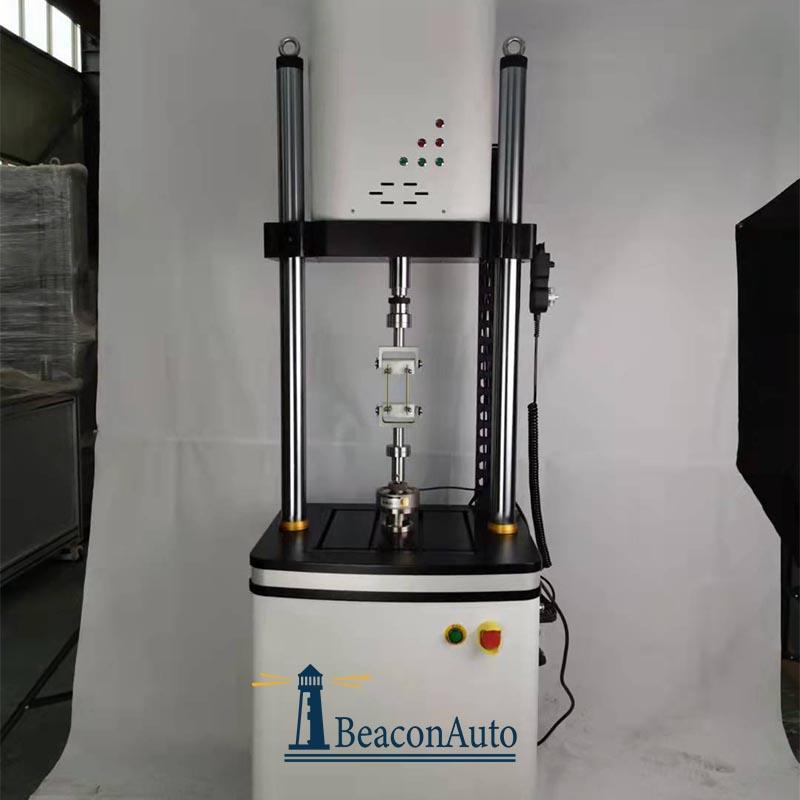主機(jī)為雙立柱框架式結(jié)構(gòu), 伺服直線作動(dòng)器下置于主機(jī)框架上部。夾頭分別安裝在橫梁和作動(dòng)器活塞桿頂端。主機(jī)橫梁調(diào)整采用電動(dòng)絲杠升降,傳動(dòng)單元隱藏在橫梁內(nèi)部,外觀整潔,主機(jī)下部工作臺(tái)為分體式,不需要刻意拆掉,整機(jī)防止在客戶指定的臺(tái)面上。手動(dòng)夾緊、彈性松開(kāi)式結(jié)構(gòu),保證試驗(yàn)過(guò)程中橫梁穩(wěn)固可靠,同時(shí)保證在非試驗(yàn)狀態(tài)時(shí)橫梁保持鎖止不動(dòng)。立柱外表面采用電鍍硬鉻處理,可有效增加立柱抗磨損能力,提高防腐蝕能力,同時(shí)增加主機(jī)外形的美觀程度。