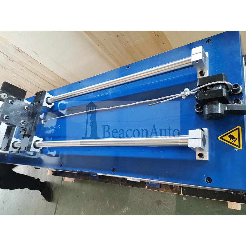 該機型采用高性能交流電機作為動力輸出,配以高精度減速電機,從而使動力能平穩(wěn)輸出。電機的驅(qū)動采用高可靠、高穩(wěn)定變頻器,提高機器運行的平順性,降低功耗。一側(cè)夾頭固定在電機輸出軸,另一側(cè)夾頭固定在可移動軸承座。移動座采用直線軸承,摩擦阻力小,保證了軸向移動的平直度。軸向拉緊力采用砝碼施加,通過10:1的L型杠桿,將作用力施加在線材上。