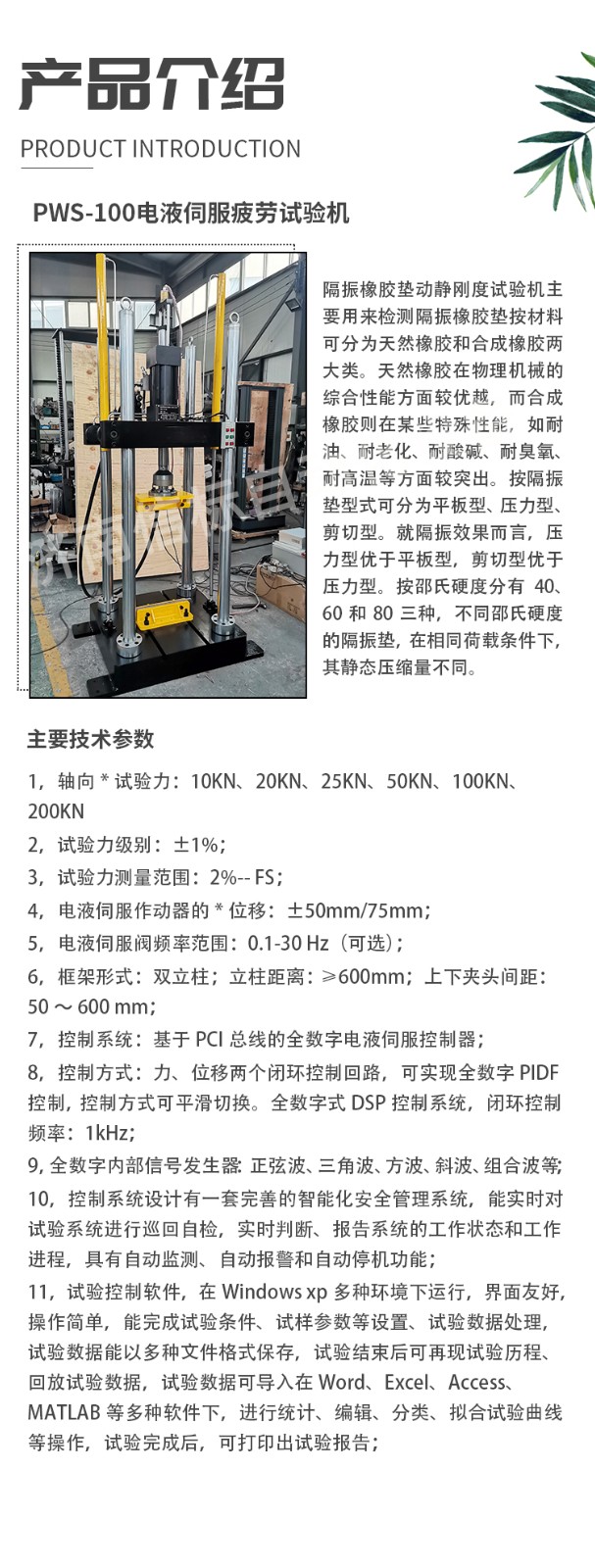 8,控制方式:力、位移兩個(gè)閉環(huán)控制回路,可實(shí)現(xiàn)全數(shù)字PIDF控制, 控制方式可平滑切換。全數(shù)字式DSP控制系統(tǒng),閉環(huán)控制頻率:1kHz ;
