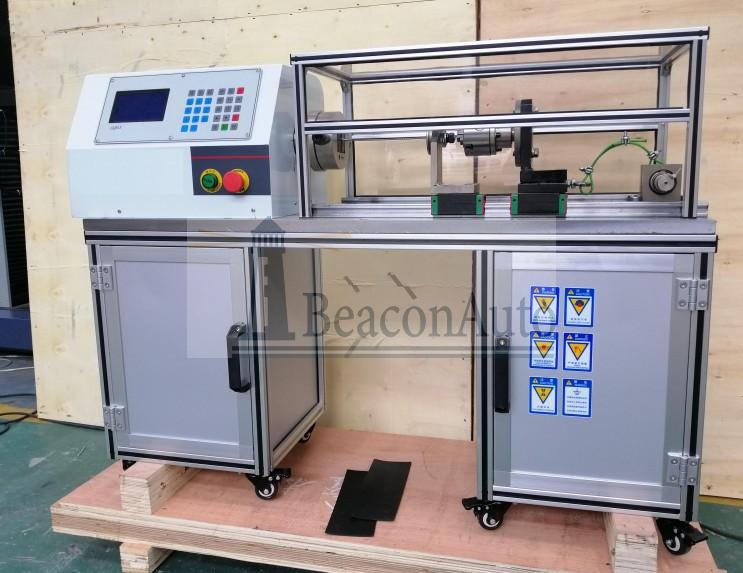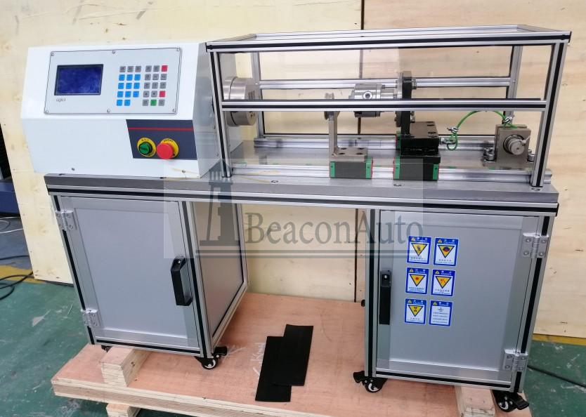 該機(jī)型采用高性能交流電機(jī)作為動(dòng)力輸出,配以高精度減速電機(jī),從而使動(dòng)力能平穩(wěn)輸出。電機(jī)的驅(qū)動(dòng)采用高可靠、高穩(wěn)定變頻器,提高機(jī)器運(yùn)行的平順性,降低功耗。一側(cè)夾頭固定在電機(jī)輸出軸,另一側(cè)夾頭固定在可移動(dòng)軸承座。移動(dòng)座采用直線軸承,摩擦阻力小,保證了軸向移動(dòng)的平直度。軸向拉緊力采用砝碼施加,通過(guò)10:1的L型杠桿,將作用力施加在線材上。