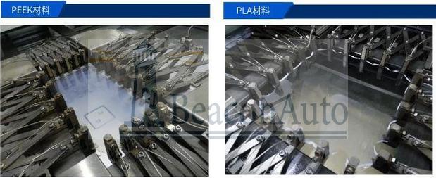 實(shí)驗(yàn)室膜片雙軸雙向拉伸試驗(yàn)機(jī)能將厚度在2 mm以下,150見方的可作雙向拉伸薄膜材料厚膜樣片,按所需的拉伸比,在適合溫度及時(shí)間內(nèi)進(jìn)行成膜拉伸實(shí)驗(yàn),供實(shí)驗(yàn)室進(jìn)行物理和化學(xué)測試分析,根據(jù)樣膜性能,確定種類繁多的添加劑和配方。并應(yīng)用到生產(chǎn)線上,可大大降低試制成本。任何可用于雙向拉伸的結(jié)晶型和非結(jié)晶型聚合物制成的厚片,都可在本機(jī)進(jìn)行靜態(tài)拉伸,