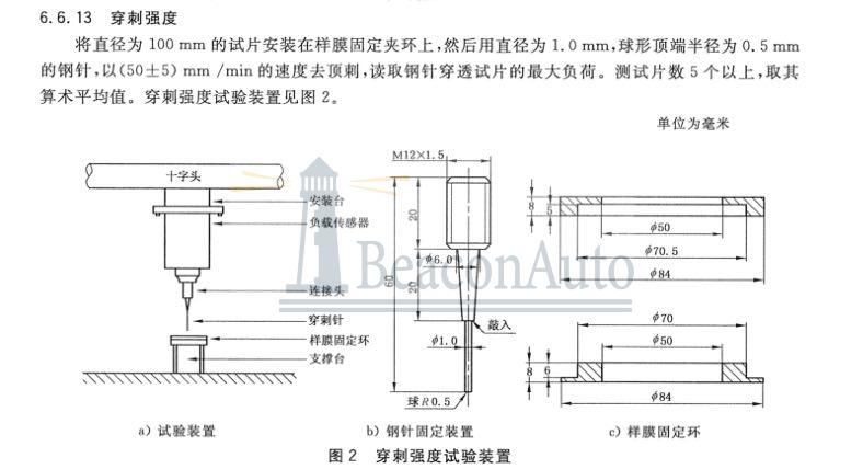 將直徑為100mm的試片安裝在樣膜固定夾環(huán)上,然后用直徑為1.0mm,球形頂端半徑為0.5mm的鋼針,以(50±5)mm/min的速度去頂刺,讀取鋼針穿透試片的大負(fù)荷,測試片數(shù)5個以上,取其平均值。