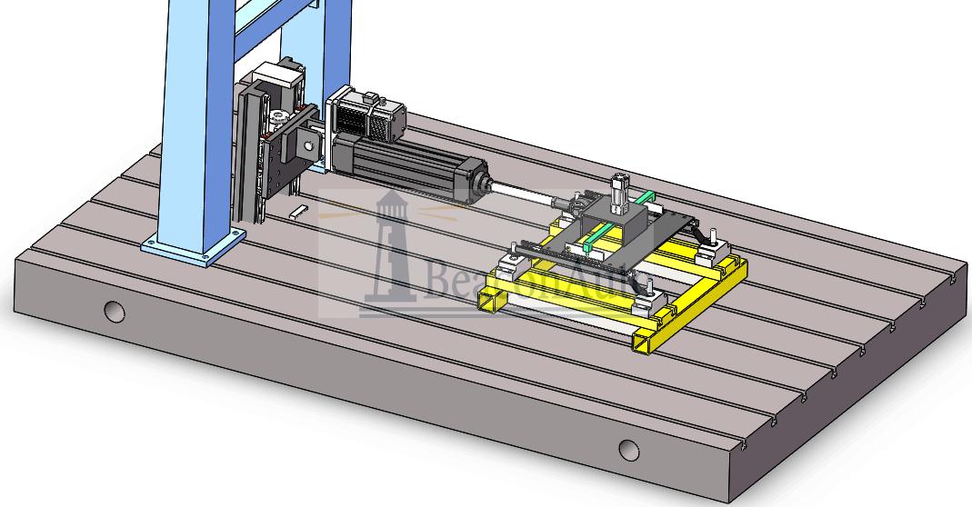 2. 水平橫梁可以上下移動,用于調(diào)整伺服作動器的位置,方便實驗位置的改變,實現(xiàn)水平和垂直加載,絲杠調(diào)整氣動鎖緊,可以使作動器傾斜一定角度,滿足調(diào)角器的靜態(tài)剛度和耐久試驗。