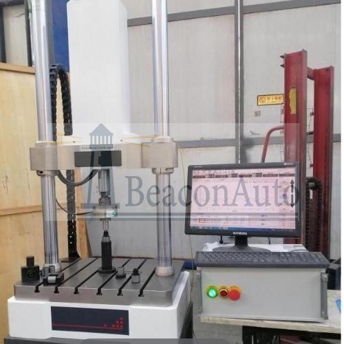主機(jī)為雙立柱框架式結(jié)構(gòu), 伺服直線作動(dòng)器下置于主機(jī)框架上部。夾頭分別安裝在橫梁和作動(dòng)器活塞桿頂端。主機(jī)橫梁調(diào)整采用電動(dòng)絲杠升降,傳動(dòng)單元隱藏在橫梁內(nèi)部,外觀整潔,主機(jī)下部工作臺(tái)為分體式,不需要刻意拆掉,整機(jī)防止在客戶Z定的臺(tái)面上。手動(dòng)夾緊、彈性松開式結(jié)構(gòu),保證試驗(yàn)過程中橫梁穩(wěn)固可靠,同時(shí)保證在非試驗(yàn)狀態(tài)時(shí)橫梁保持鎖止不動(dòng)。立柱外表面采用電鍍硬鉻處理,可有效增加立柱抗磨損能力,提高防腐蝕能力,同時(shí)增加主機(jī)外形的美觀程度。