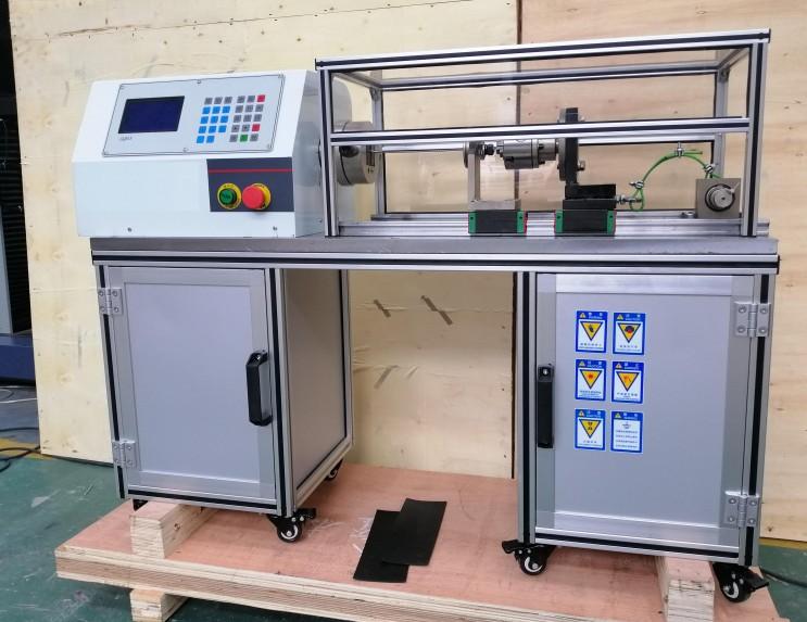該機(jī)型采用高性能交流電機(jī)作為動力輸出,配以高精度減速電機(jī),從而使動力能平穩(wěn)輸出。電機(jī)的驅(qū)動采用高可靠、高穩(wěn)定變頻器,提高機(jī)器運行的平順性,降低功耗。一側(cè)夾頭固定在電機(jī)輸出軸,另一側(cè)夾頭固定在可移動軸承座。移動座采用直線軸承,摩擦阻力小,保證了軸向移動的平直度。軸向拉緊力采用砝碼施加,通過10:1的L型杠桿,將作用力施加在線材上。