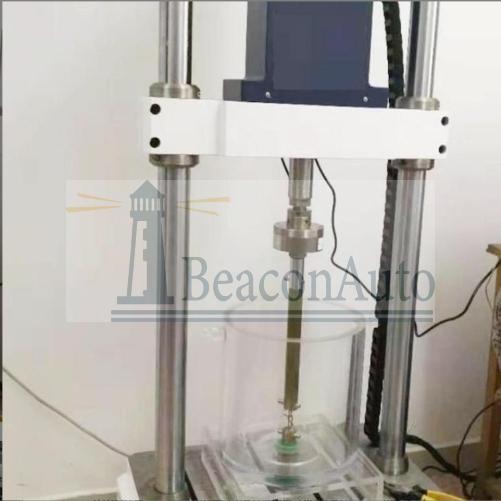 1、主機(jī):主機(jī)為雙立柱框架式結(jié)構(gòu), 100kN伺服直線作動(dòng)器上置于主機(jī)框架內(nèi)部。強(qiáng)迫液壓夾頭分別安裝在橫梁和作動(dòng)器活塞桿頂端。主機(jī)橫梁調(diào)整采用液壓升降、液壓夾緊、彈性松開式結(jié)構(gòu),保證試驗(yàn)過程中橫梁穩(wěn)固可靠,同時(shí)保證在非試驗(yàn)狀態(tài)時(shí)橫梁保持鎖止不動(dòng)。立柱外表面采用電鍍硬鉻處理,可有效增加立柱抗磨損能力,提高防腐蝕能力,同時(shí)增加主機(jī)外形的美觀程度。